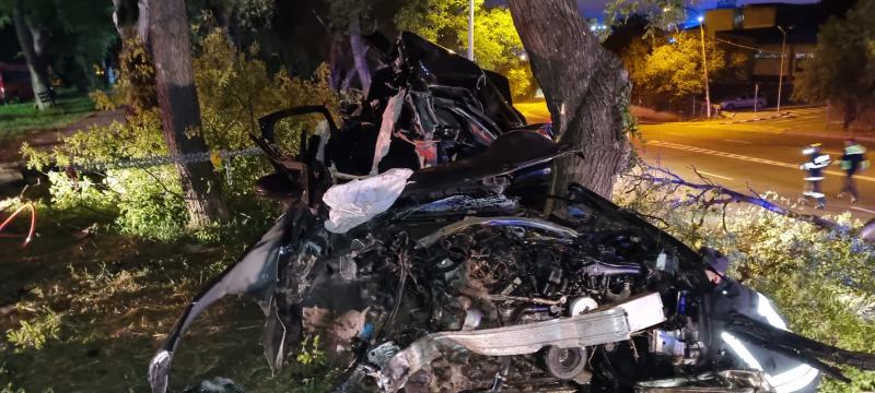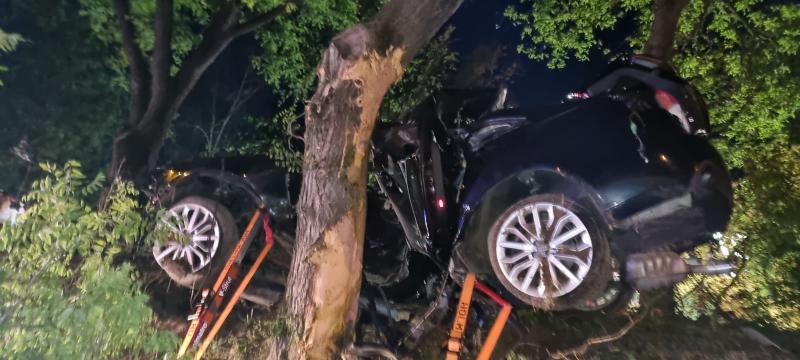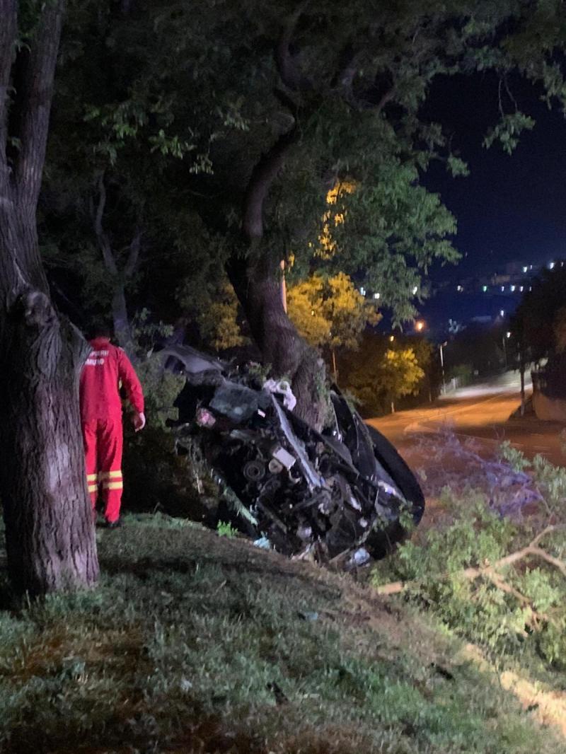 Bolidul s-a oprit într-un pom, iar impactul a fost atât de puternic, încât maşina s-a încolăcit efectiv în jurul trunchiului. Imaginile suprinse la faţa locului arată dimensiunea dezastrului.