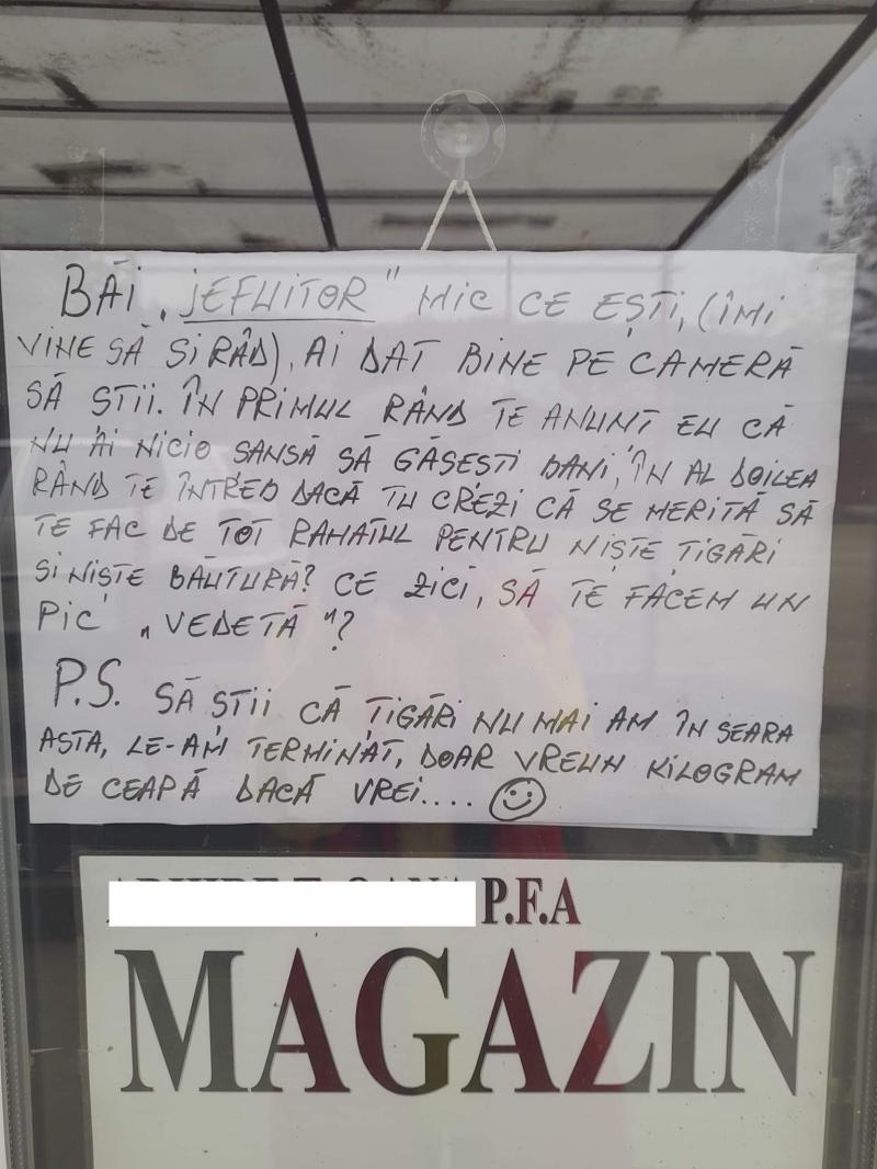 O vânzătoare din Huşi a lăsat un mesaj pe uşa magazinului pentru hoţul care "vizita" localul în fiecare seară.