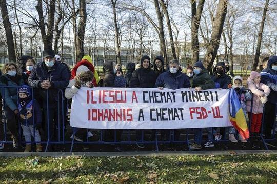 Bannerul afişat de câţiva dintre cei care asistă la parada militară organizată la Arcul de Triumf conţine mesajul ”Iliescu a chemat minerii. Iohannis a chemat PSD-ul”, potrivit imaginilor de la eveniment.