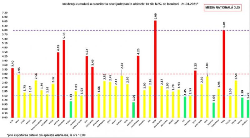 Incidenţa cazurilor de Covid-19 în România - 21 martie 2021