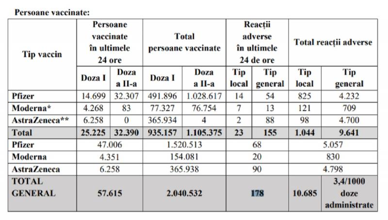 Potrivit datelor puse la dispoziția Comitetului Național de Coordonare a Activităților privind Vaccinarea împotriva COVID-19 (CNCAV) de către Institutul Național de Sănătate Publică (INSPCNSCBT), prin aplicația Registrul Electronic Național al Vaccinărilor (RENV), care ține evidența vaccinărilor, situația din ziua de 01 aprilie a.c., ora 17.00, este următoarea: