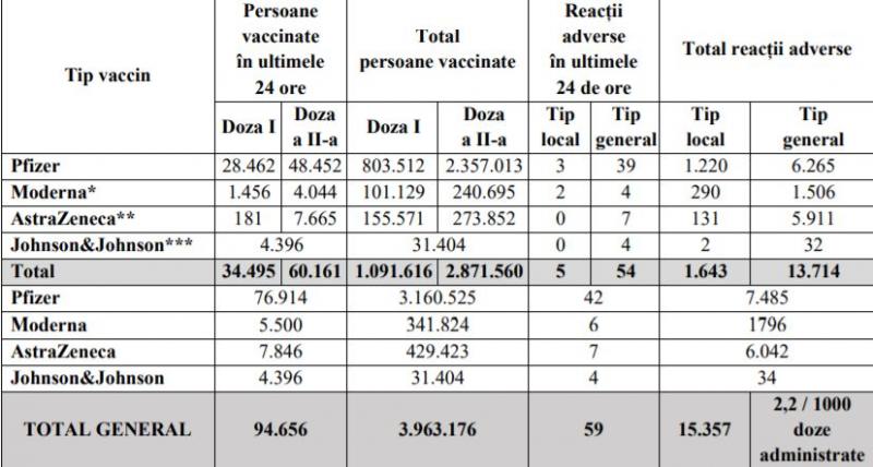 Potrivit datelor puse la dispoziția Comitetului Național de Coordonare a Activităților privind Vaccinarea împotriva COVID-19 (CNCAV) de către Institutul Național de Sănătate Publică (INSP-CNSCBT), prin aplicația Registrul Electronic Național al Vaccinărilor (RENV), care ține evidența vaccinărilor, situația din ziua de 17 mai a.c., ora 17.00, este următoarea: