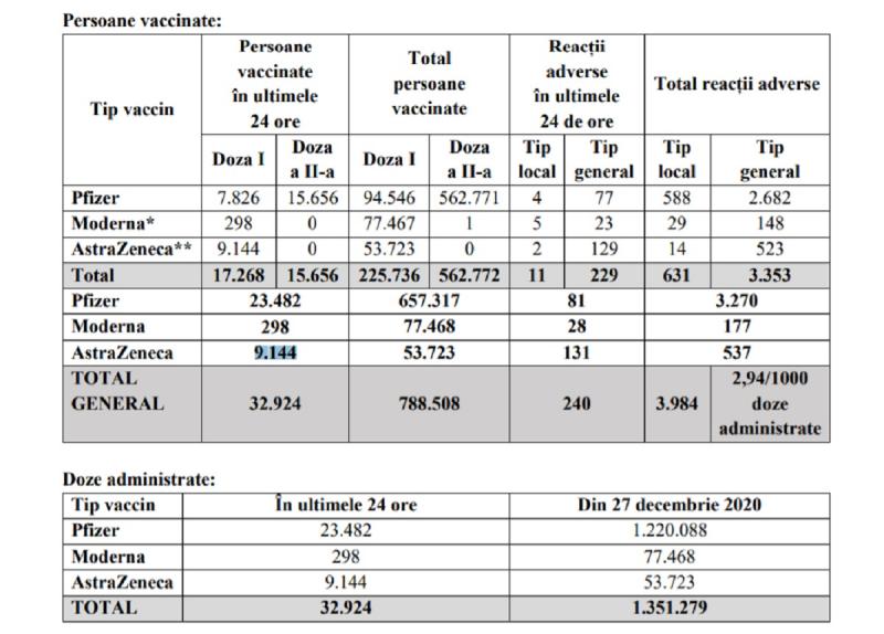 1. Numărul de doze administrate împotriva COVID-19 cu vaccinul Pfizer BioNTech (în ultimele 24 de ore): 23.482, din care: 7.826 de persoane vaccinate cu 1 doză; 15.656 de persoane vaccinate cu 2 doze.