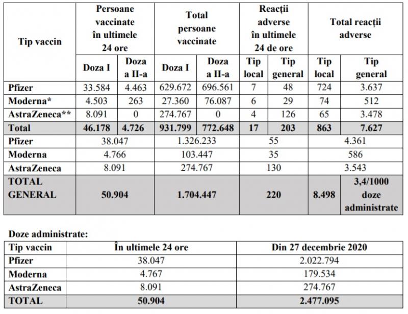 1.704.447 de persoane au fost vaccinate până acum anti-Covid în România, potrivit Comitetului Național de Coordonare a Activităților privind Vaccinarea împotriva COVID-19 (CNCAV). În România, campania de imunizare a populaţiei a început de pe data de 27 decembrie 2020. Cele trei vaccinuri folosite în prezent sunt Pfizer BioNTech, Moderna şi Oxford-AstraZeneca.