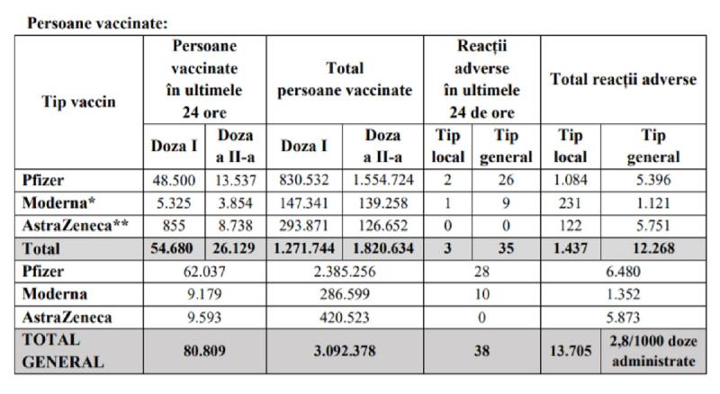 Potrivit datelor puse la dispoziția Comitetului Național de Coordonare a Activităților privind Vaccinarea împotriva COVID-19 (CNCAV) de către Institutul Național de Sănătate Publică (INSPCNSCBT), prin aplicația Registrul Electronic Național al Vaccinărilor (RENV), care ține evidența vaccinărilor, situația din ziua de 26 aprilie a.c., ora 17.00, este următoarea:
