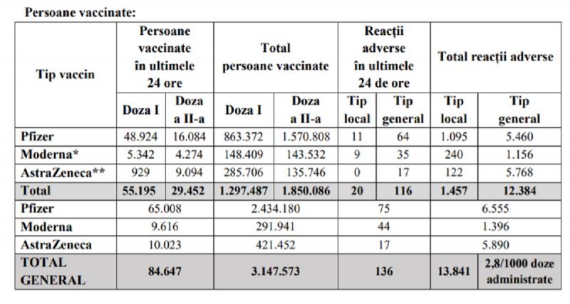 4. Numărul de reacții adverse înregistrate la nivelul centrelor de vaccinare: 136, dintre care 75 de reacții la vaccinul Pfizer, 44 de reacții adverse la vaccinul Moderna și 17 reacții adverse la vaccinul AstraZeneca.