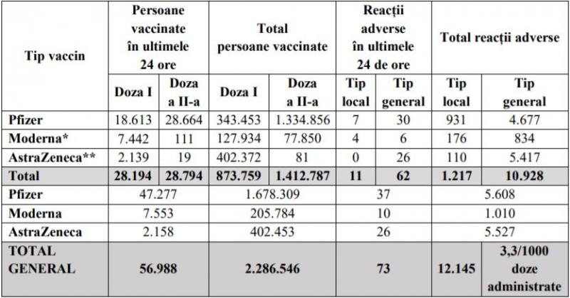 Potrivit datelor puse la dispoziția Comitetului Național de Coordonare a Activităților privind Vaccinarea împotriva COVID-19 (CNCAV) de către Institutul Național de Sănătate Publică (INSPCNSCBT), prin aplicația Registrul Electronic Național al Vaccinărilor (RENV), care ține evidența vaccinărilor, situația din ziua de 11 aprilie a.c., ora 17.00, este următoarea: