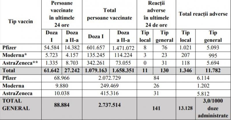 4. Numărul de reacții adverse înregistrate la nivelul centrelor de vaccinare: 141, dintre care 84 de reacții la vaccinul Pfizer, 26 reacții adverse la vaccinul Moderna și 31 reacții adverse la vaccinul AstraZeneca.