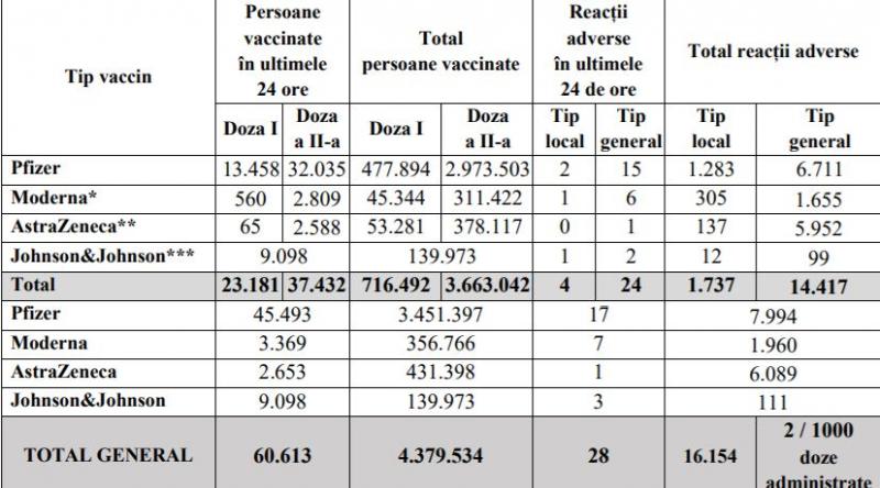 Potrivit datelor puse la dispoziția Comitetului Național de Coordonare a Activităților privind Vaccinarea împotriva COVID-19 (CNCAV) de către Institutul Național de Sănătate Publică (INSP-CNSCBT), prin aplicația Registrul Electronic Național al Vaccinărilor (RENV), care ține evidența vaccinărilor, situația din ziua de 3 iunie a.c., ora 17.00, este următoarea: