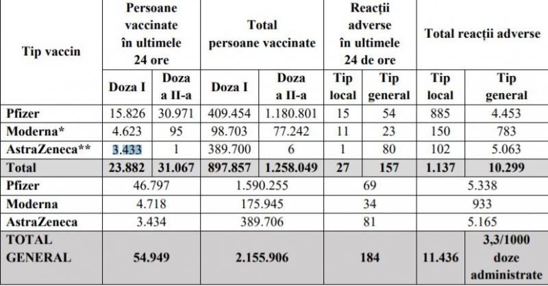 Potrivit datelor puse la dispoziția Comitetului Național de Coordonare a Activităților privind Vaccinarea împotriva COVID-19 (CNCAV) de către Institutul Național de Sănătate Publică (INSPCNSCBT), prin aplicația Registrul Electronic Național al Vaccinărilor (RENV), care ține evidența vaccinărilor, situația din ziua de 6 aprilie a.c., ora 17.00, este următoarea: