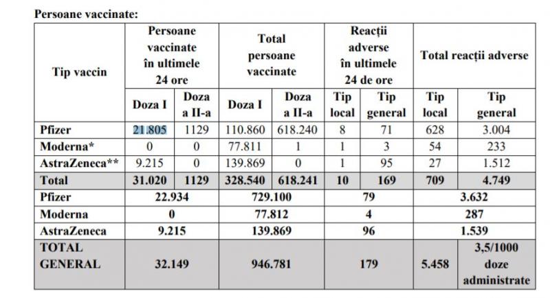 Potrivit datelor puse la dispoziția CNCAV de către Institutul Național de Sănătate Publică, prin aplicația Registrul Electronic Național al Vaccinărilor (RENV), care ține evidența vaccinărilor, situația din ziua de 1 martie a.c., ora 17.00, este următoarea: