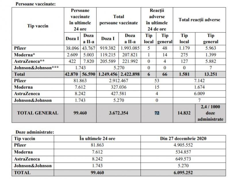 Potrivit datelor puse la dispoziția Comitetului Național de Coordonare a Activităților privind Vaccinarea împotriva COVID-19 (CNCAV) de către Institutul Național de Sănătate Publică (INSP-CNSCBT), prin aplicația Registrul Electronic Național al Vaccinărilor (RENV), care ține evidența vaccinărilor, situația din ziua de 10 mai a.c., ora 17.00, este următoarea: