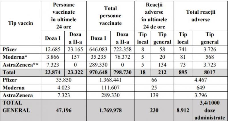 Potrivit datelor puse la dispoziția Comitetului Național de Coordonare a Activităților privind Vaccinarea împotriva COVID-19 (CNCAV) de către Institutul Național de Sănătate Publică (INSPCNSCBT), prin aplicația Registrul Electronic Național al Vaccinărilor (RENV), care ține evidența vaccinărilor, situația din ziua de 22 martie a.c., ora 17.00, este următoarea:
