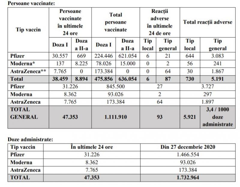Potrivit datelor puse la dispoziția CNCAV de către Institutul Național de Sănătate Publică, prin aplicația Registrul Electronic Național al Vaccinărilor (RENV), care ține evidența vaccinărilor, situația din ziua de 5 martie a.c., ora 17.00, este următoarea: