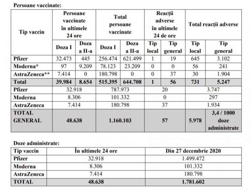 Potrivit datelor puse la dispoziția CNCAV de către Institutul Național de Sănătate Publică, prin aplicația Registrul Electronic Național al Vaccinărilor (RENV), care ține evidența vaccinărilor, situația din ziua de 6 martie a.c., ora 17.00, este următoarea: