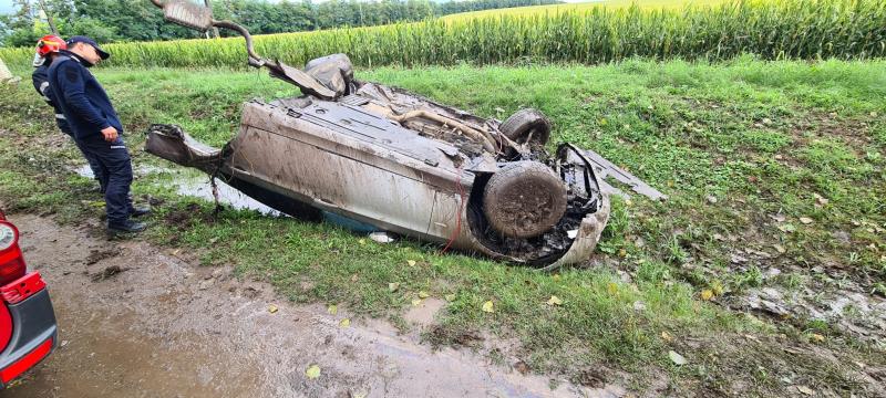 În urma impactului teribil, BMW-ul s-a răsturnat și s-a rupt în două.