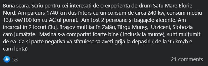"Bună seara. Scriu pentru cei interesați de o experiență de drum Satu Mare Eforie Nord. Am parcurs 1740 km dus întors cu un consum de circa 240 kw, consum mediu 13,8 kw/100 km cu AC ul pornit.