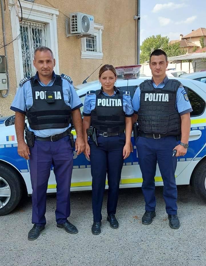 "De la stânga la dreapta, Petre, Roxana și Claudiu, polițiști ai Secției 5 din orașul Strehaia, județul Mehedinți! Dragi colegi, „jos pălăria”!", a scris Poliţia Română pe Facebook.