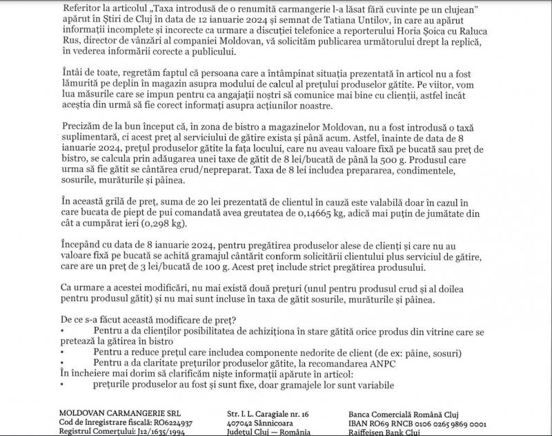 Reprezentanții carmangeriei Moldovan au transmis un drept la replică. Ei susțin că nu a fost introdusă o taxă suplimentară, iar prețul serviciului de gătire exista și până acum.
