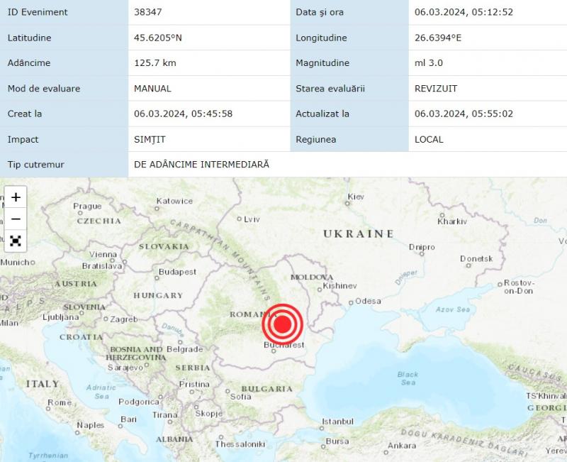 Potrivit INFP, cutremurul a avut loc la ora 5.12 în județul Vrancea. Acesta a avut magnitudinea 3.0 și s-a produs la adâncimea de 125.7 km.