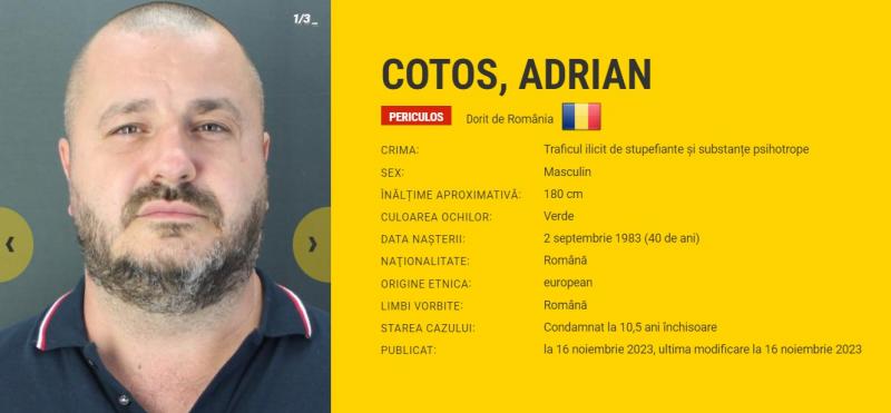 Primul dintre ei se numește Adrian Cotos, zis Cotoiu, are 40 de ani și este condamnat la 10,5 ani de închisoare pentru traficul ilicit de stupefiante și substanțe psihotrope. Potrivit Europol, "în cursul anului 2021, s-a ocupat de trafic de droguri de mare risc (cocaină)".