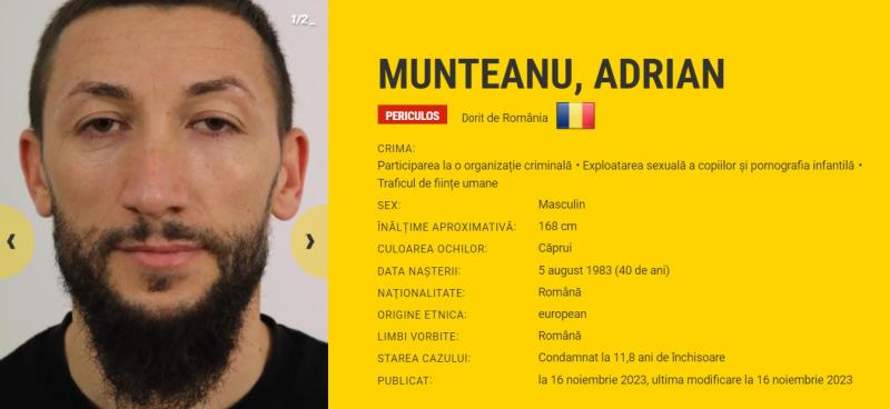 Cel de-al doilea român periculos căutat de Europol se numește Adrian Munteanu și are tot 40 de ani. Bărbatul, de loc din Vrancea, este condamnat la 11,8 ani de închisoare pentru participarea la o organizație criminală, exploatarea sexuală a copiilor și pornografia infantilă și trafic de ființe umane. Potrivit Europol, "în perioada 2012 - 2017, s-a alăturat unui grup infracțional organizat, care se ocupa cu traficul de ființe umane în scopul exploatării sexuale, inclusiv cu o fată minoră".