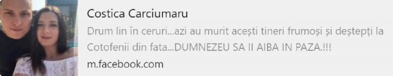"Drum lin în ceruri...azi au murit acești tineri frumoși și deștepți la Coţofenii din Faţă...DUMNEZEU SĂ ÎI AIBĂ ÎN PAZĂ!!!", a scris fostul primar al comunei.