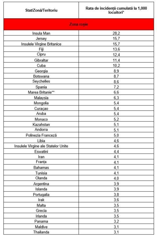 Noua lista va intra în vigoare de la 8 august 2021. În acest sens, în zona roșie intră: Franța, Islanda, Thailanda, Aruba, Polinezia Franceză și Eswatini. În ceea ce priveşte zona galbenă intră: