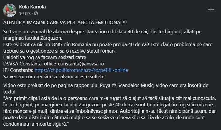 ”Am primit clipul ăsta de la o persoană care m-a rugat să o ajut să facă situaţia cât mai cunoscută. În Techirghiol, pe marginea lacului Zarguzon, peste 40 de cai sunt ţinuţi legaţi în frig şi în mizerie, fără mâncare şi mulţi dintre ei se îmbolnăvesc şi mor. Autorităţile n-au făcut nimic până acum, dar poate dacă distribuim cât mai mulţi o să se sesizeze cineva şi o să-i ia de acolo, de unde sunt condamnaţi la moarte sigură", a scris Puya pe Facebook.