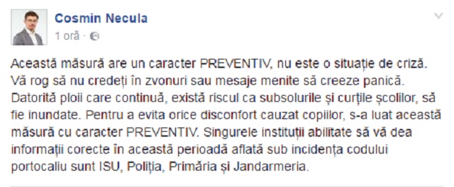 ”Vă rog să nu credeți în zvonuri sau mesaje panicante. Datorită ploii care continuă să cadă, există riscul ca subsolurile și curțile școlilor, să fie inundate. Pentru a evita orice disconfort cauzat copiilor, s-a luat această măsură cu caracter PREVENTIV. Singurele instituții abilitate să vă dea informații corecte în această perioadă aflată sub incidența codului portocaliu sunt ISU, Poliția, Primăria și Jandarmeria”, a mai scris primarul.
