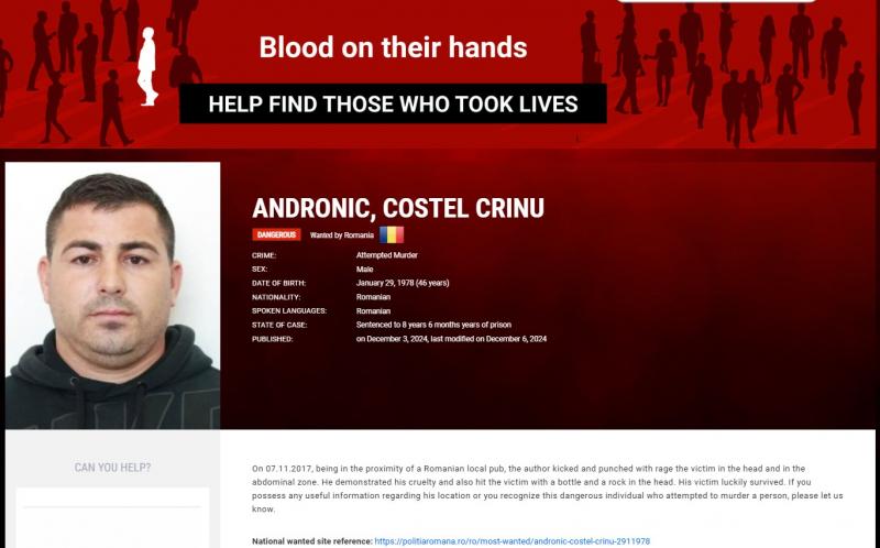 Andronic Costel Crinu, condamnat la 8 ani și 6 luni de închisoare pentru tentativă de omor, produsă în 2017, este dat în urmărire în cadrul unei campanii lansate de ENFAST, Europol, Poliția Română și agențiile de aplicare a legii din alte state membre.