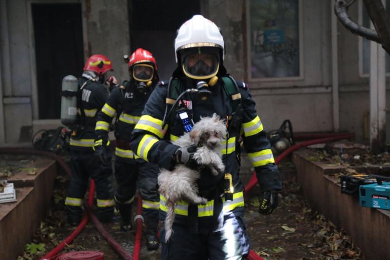 UPDATE. În clădire au fost găsiţi 2 căţei, care au fost scoşi de pompieri.