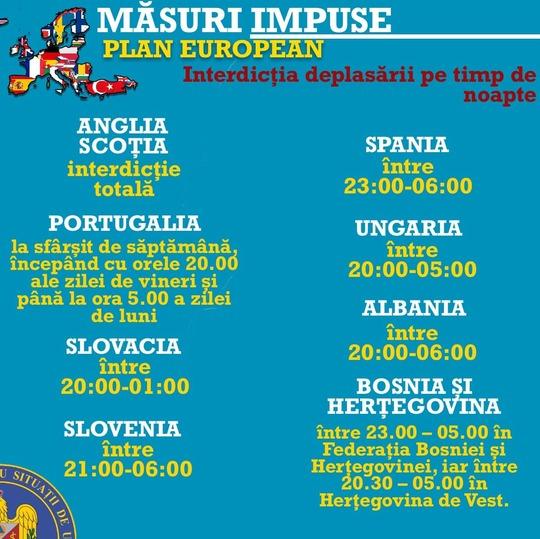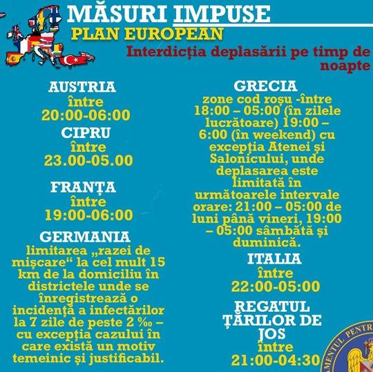 Departamentul pentru Situaţii de Urgenţă prezintă, luni seară, lista ţărilor care au impus retricţii de circulaţie pe timpul nopţii pentru a reduce răspândrea pandemiei. ”Restricţiile luate la nivelul României, pe lângă rolul acestora de a diminua presiunea regăsită la nivelul întregului sistem medical, au in final rol de prevenţie şi salvare de vieţi”, a transmis DSU.