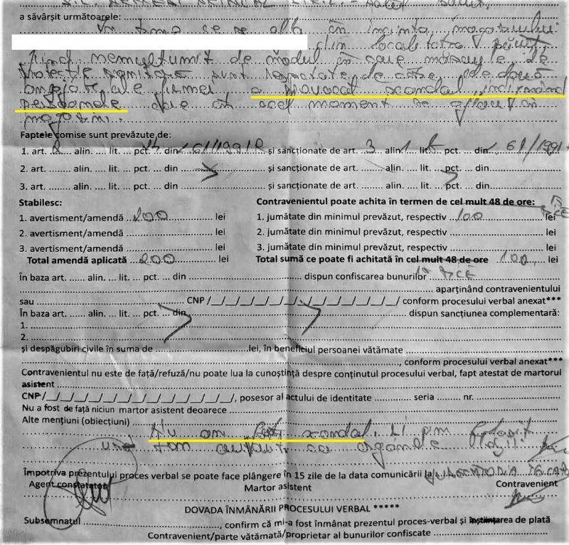 Autor filmare: "M-au amendat pentru ca angajatele consideră că am făcut scandal şi angajatele nu poartă mască de obicei, doar de formă şi în general sub nas sau deloc. Mulţi clienţi o poartă pe bărbie sau deloc. Patronul magazinului a fost în octombrie internat cu Covid-19 în spital. Poliţia a crezut angajatele şi pe patron şi a venit de martor chiar domnul care nu avea mască deloc"