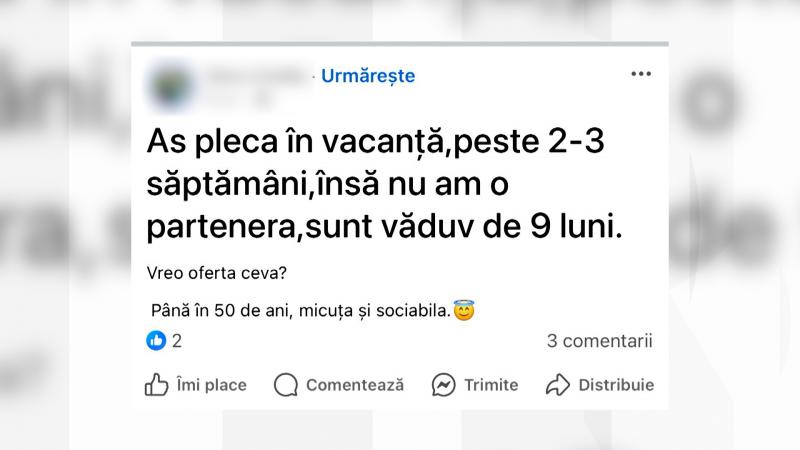 "Aş pleca în vacanţă peste 2-3 săptămâni, însă nu am o parteneră. Sunt văduv de 9 luni. Vreo ofertă ceva_Până în 50 de ani, micuţă şi sociabilă".