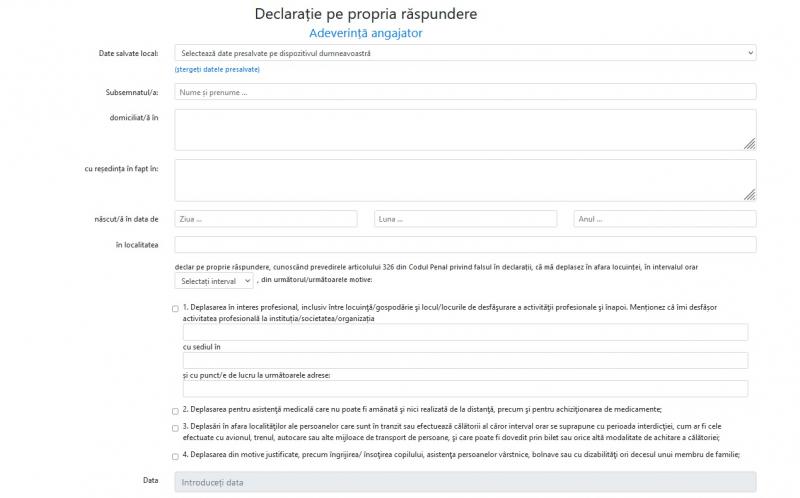 Declaraţia pe proprie răspundere poate fi accesată şi descărcată de pe site-ul Serviciului de Telecomunicaţii Speciale. Conform regulilor CNSU, pentru verificarea motivului deplasării în interes personal, persoanele nevaccinate sunt obligate să prezinte, la cererea personalului autorităților abilitate, această declarație completată în prealabil, care trebuie să cuprindă numele și prenumele, data nașterii, adresa locuinței/gospodăriei, motivul deplasării, data completării și semnătura.