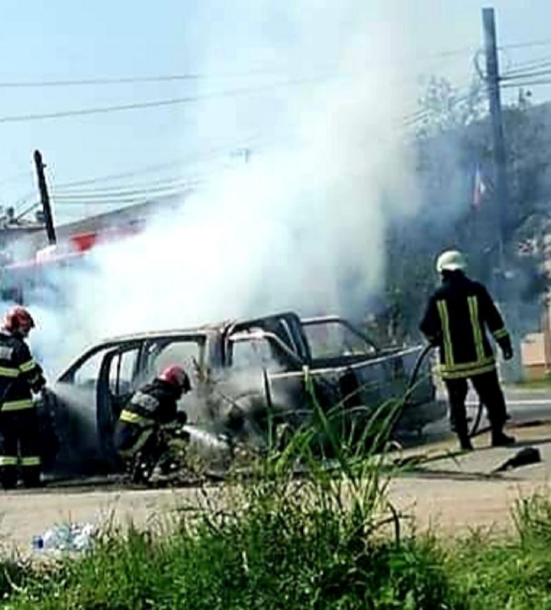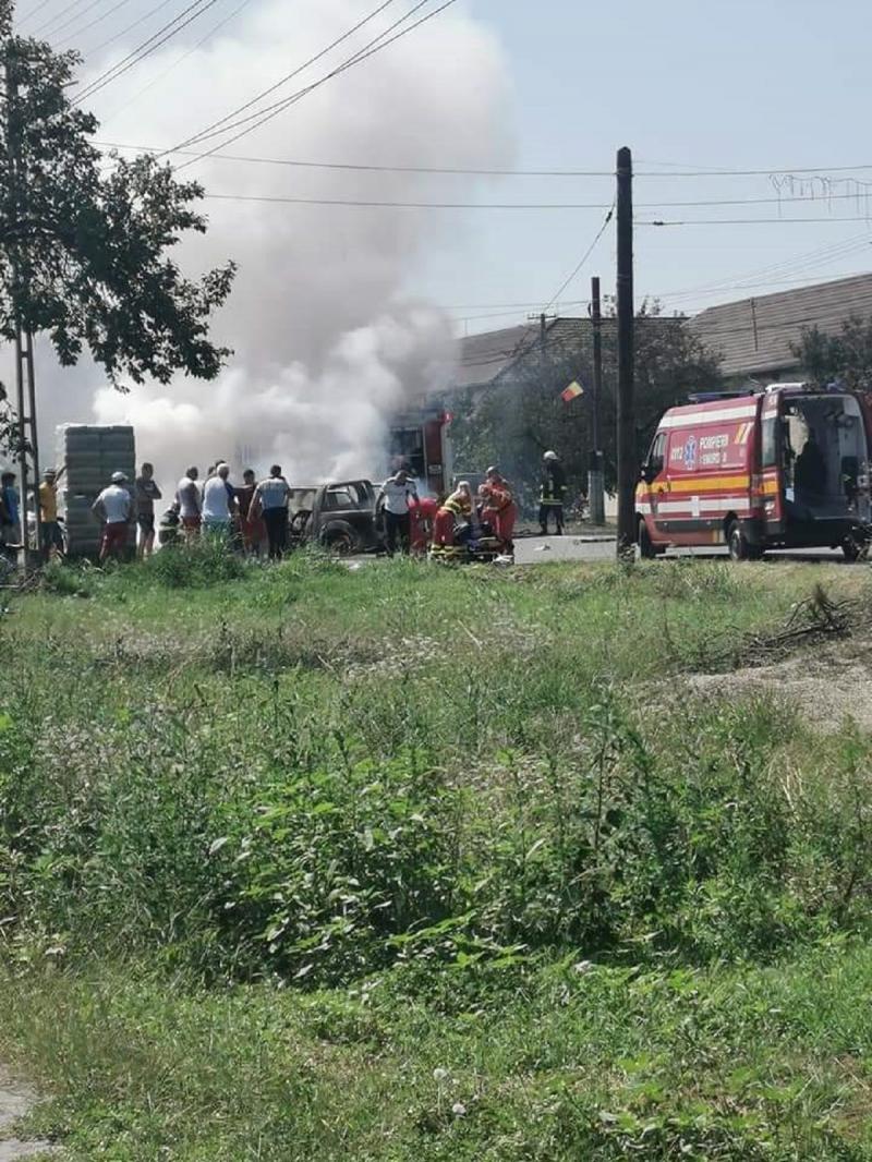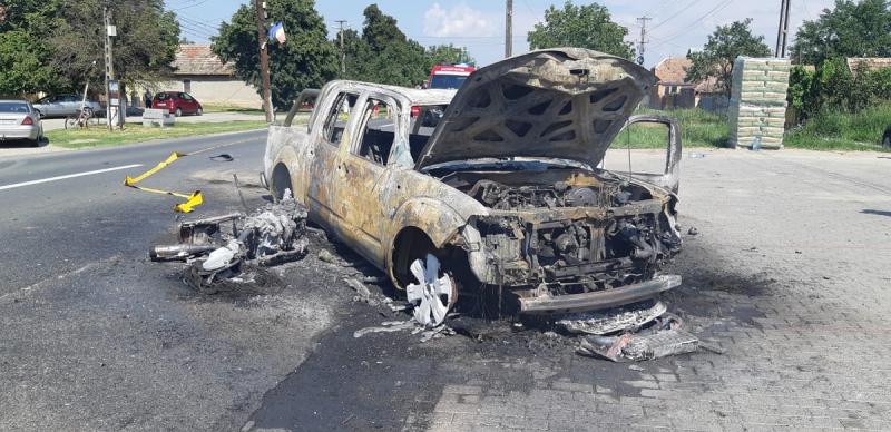 În urma impactului, atât autoturismul, cât și motocicleta au luat foc.
