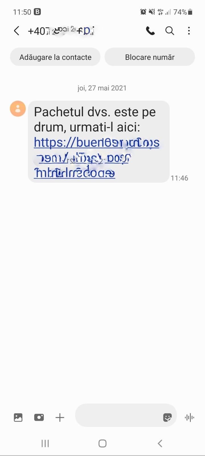 "Nu accesați link-uri primite prin SMS, din surse necunoscute! Mai multe persoane au primit mesaje SMS, de pe diverse numere de telefon (naționale sau internaționale), cu textul „Pachetul dvs. este în drum, urmăriți-l aici”, urmat de un link.