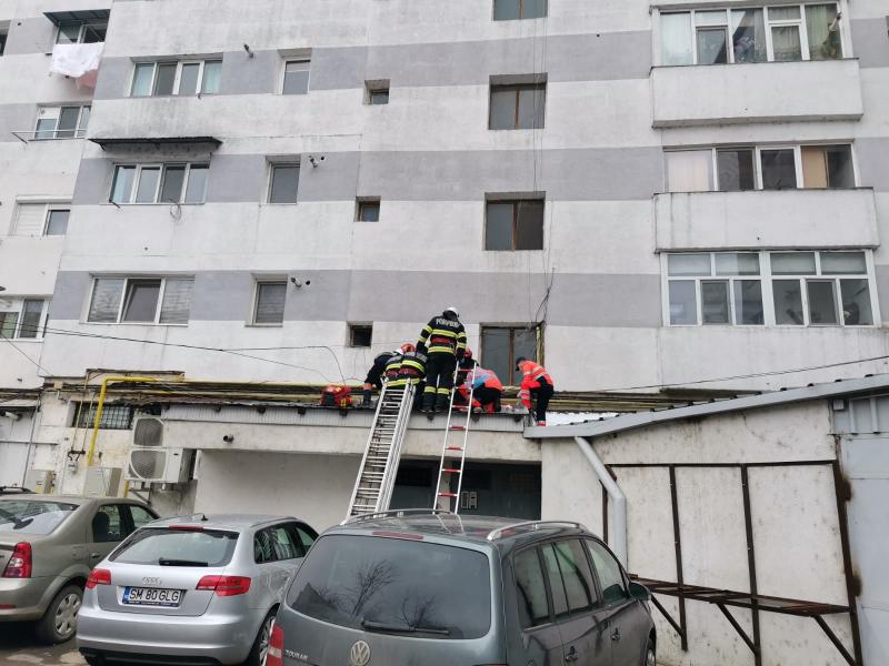 La sosirea echipajelor de intervenție, femeia a fost găsită pe copertina din beton care proteja intrarea în scara blocului.