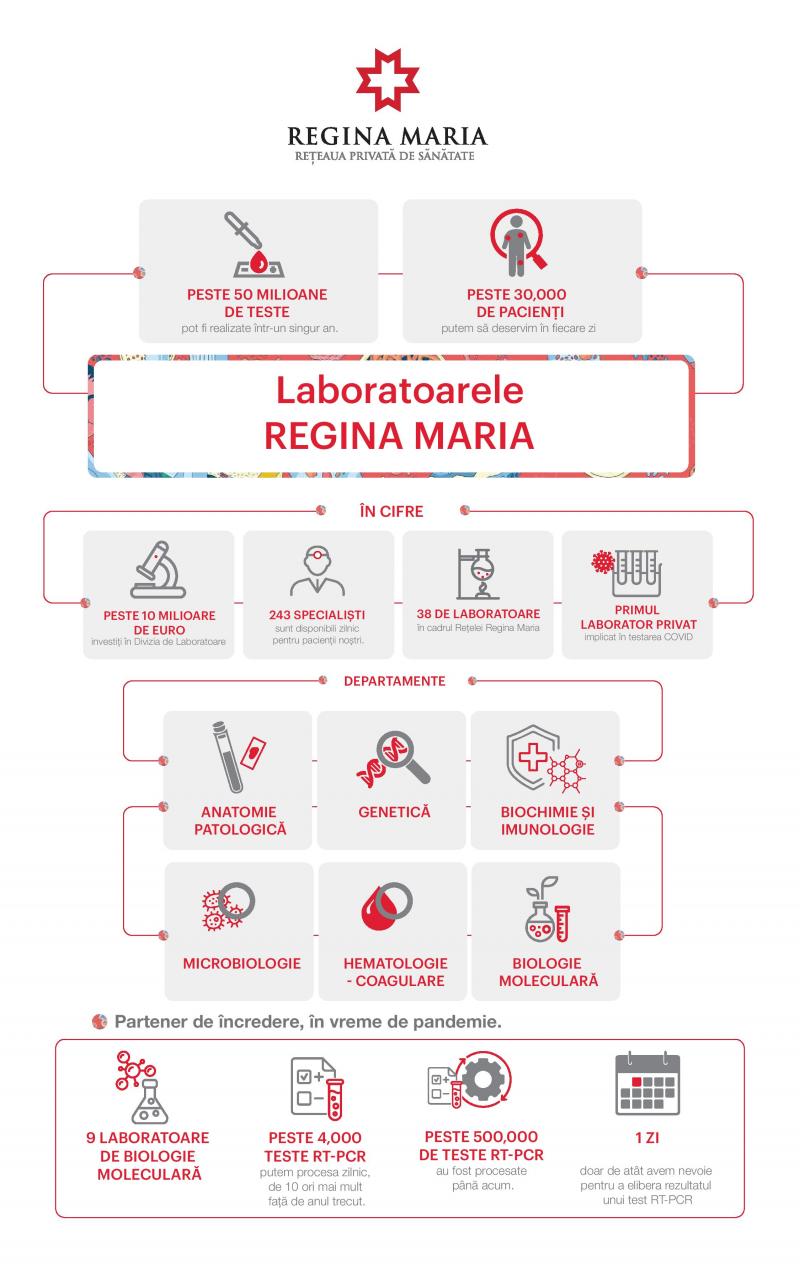 Prin investițiile realizate în divizia de laboratoare clinice, Rețeaua de sănătate REGINA MARIA se implică activ în sănătatea românilor, fiind primul operator privat din România care a început anul trecut procesarea testelor RT-PCR pentru diagnosticarea COVID-19. Datorită celor peste 10 milioane de euro investiți, laboratoarele Rețelei asigură acuratețe în diagnosticare, reducerea erorilor umane și ramân un partener de încredere în gestionarea sănătății populației în timp de pandemie.