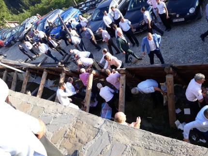 Incidentul s-a produs la o pensiune din stațiunea Durău, județul Neamț. Balustrada terasei a cedat, iar nuntașii s-au prăbușit în gol de la câțiva metri.