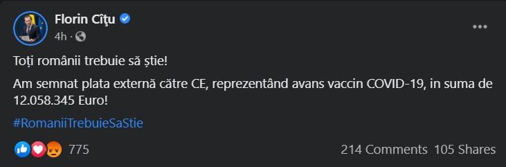 Florin Cîţu, ministrul de Finanţe: "Toţi românii trebuie să ştie! Am semnat plata externă către CE, reprezentând avans vaccin COVID-19, în suma de 12.058.345 Euro!"
