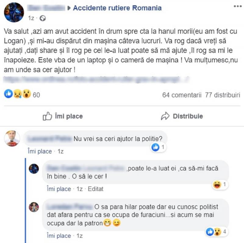"Va salut, azi am avut accident în drum spre cta la hanul morii (eu am fost cu Logan), și mi-au dispărut din mașina câteva lucruri. Va rog dacă vreți să ajutați, dați share și îl rog pe cel le-a luat poate să mă ajute, îl rog sa mi le înapoieze. Este vorba de un laptop și o cameră de mașina! Va mulțumesc, nu am unde sa cer ajutor!", este mesajul bărbatului, care a publicat mai multe imagini de la locul accidentului.