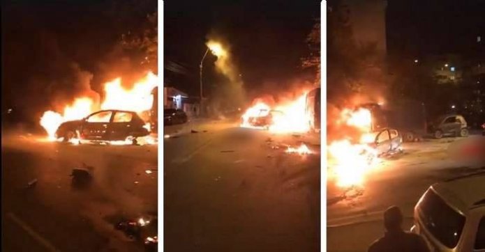 Incendiul s-a declanşat după impactul a două autovehicule, iar ulterior focul s-a extins la alte trei maşini parcate.