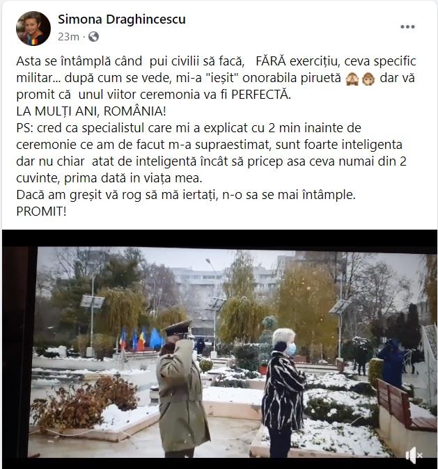 Simona Draghincescu, subprefect Brăila: "Asta se întâmplă când pui civilii să facă, fără exercițiu, ceva specific militar... după cum se vede, mi-a "ieșit" onorabila piruetă, dar vă promit că unul viitor ceremonia va fi prefectă. La Mulţi Ani, România! PS: cred ca specialistul care mi-a explicat cu 2 minute inainte de ceremonie ce am de facut m-a supraestimat, sunt foarte inteligenta dar nu chiar atat de inteligentă, încât să pricep asa ceva numai din 2 cuvinte, prima dată in viața mea. Dacă am greșit vă rog să mă iertați, n-o sa se mai întâmple. Promit!"