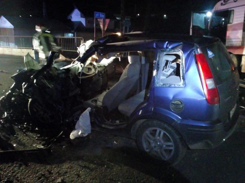 Din primele informații, șoferul unui Ford Fusion a pierdut controlul volanului și a izbit un camion care venea din sens opus.