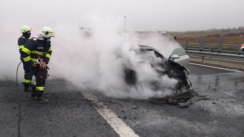 Salvatorii au fost chemați să intervină pe A6, cu 9 kilometri înainte de Lugoj, după ce un autoturism a luat foc în mers.