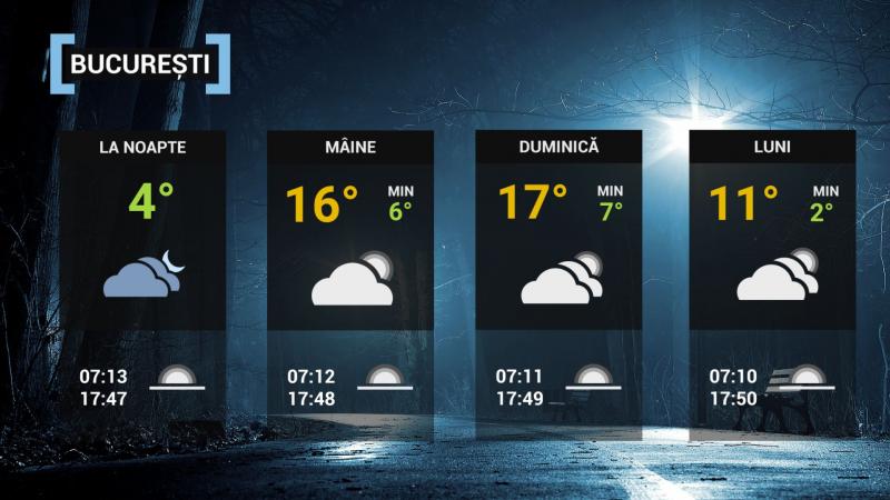 La noapte, cerul va fi temporar noros, dar condiţiile de ploaie reduse. Vântul va sufla slab şi moderat. Temperatura minimã, mai ridicatã decât în mod normal la aceastã datã, va fi de 2...4 grade.
