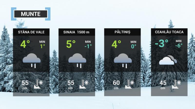 Vremea va fi vântoasã, cu temperaturi mai ridicate decât în mod normal la aceastã datã. Vântul va avea intensificãri susţinute, cu rafale de 70...100 km/h, iar la altitudini mai mari de 1700 m va sufla tare cu peste 100...120 km/h şi va fi viscol puternic. Cerul va fi mai mult noros şi temporar vor fi precipitaţii mixte (predominant ninsori la altitudini de peste 1700, în special în zona Carpaţilor Orientali, unde stratul de zãpadã va fi mai consistent). Cantitãţile de precipitaţii vor fi mai însemnate şi vor depãşi pe alocuri 25...40 l/mp în Munţii Apuseni şi în zona Carpaţilor Orientali.