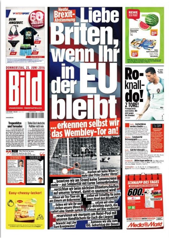 "Dragi britanici, dacă rămâneţi în UE (...), atunci noi vom recunoaşte golul de pe Wembley", scrie Bild deasupra unei imagini cu golul controversat al lui Geoff Hurst în prelungirile Finalei Cupei Mondiale din 1966, când englezii i-au învins pe vest-germani.